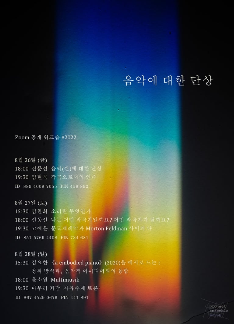 작년에 이어 올해 “음악에 대한 단상” Zoom 워크숍을 합니다. 한국의 젊은 작곡가, 예술가들이 자신의 작업과 사유를 공유함으로 우리는 현재를 마주하고 알 수 있습니다. 이러한 앎으로 우리는 예술적으로 더 깊은 차원에서 서로를 이해하고 그다음을 세심하게 도모할 수 있을 것입니다. 창작자는 기본적으로 홀로 작업합니다. 때문에 헐거운 사회망을 이를 통해 조금 이어보고자 합니다. 부디 관심 있는 분들의 기꺼운 참여를 바랍니다. 고맙습니다.