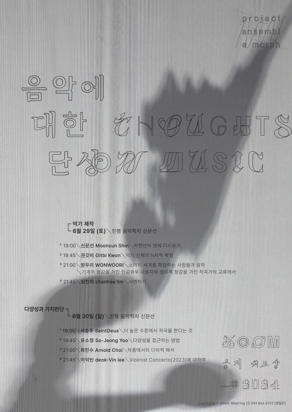 우리는 이를 통해 지금의 우리를 마주하고 서로를 이해하며 헐거운 관계망을 더욱 단단히 하여 함께 앞으로 나아가고자 합니다. 여러 작곡가와 음악가 선배님, 후배님, 동료분들을 비롯하여 동시대 예술음악에 관심 있는 분들의 많은 참여를 바랍니다. 감사합니다.